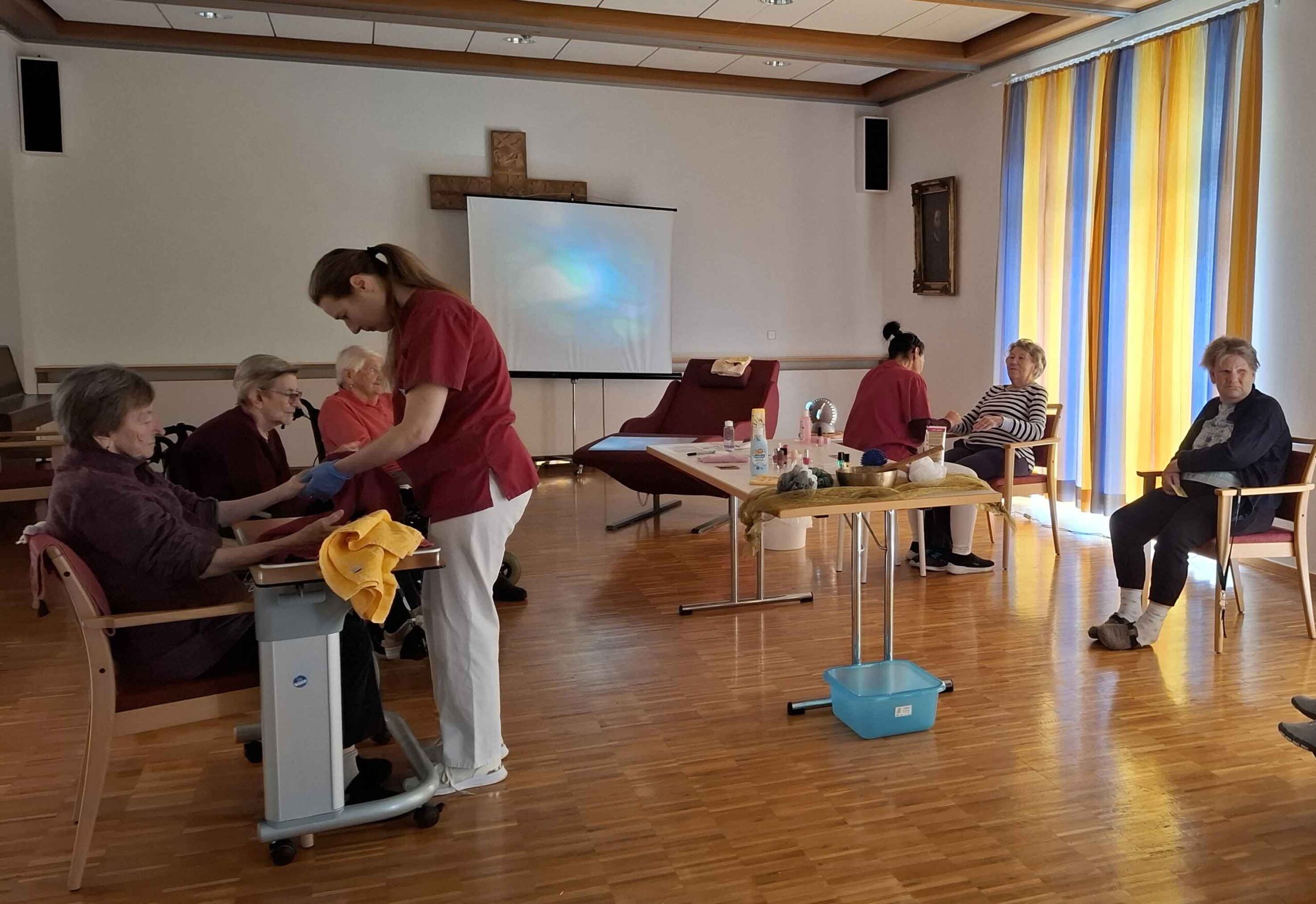 Eine Wellness-Stunde gab es kürzlich im Kreis-Seniorenwohnheim St. Andreas in Babenhausen. Die Hand- und Gesichtsmassagen haben die Bewohnerinnen und Bewohner sehr genossen. Und im Anschluss freuten sich die Damen über die frisch lackierten Fingernägel.