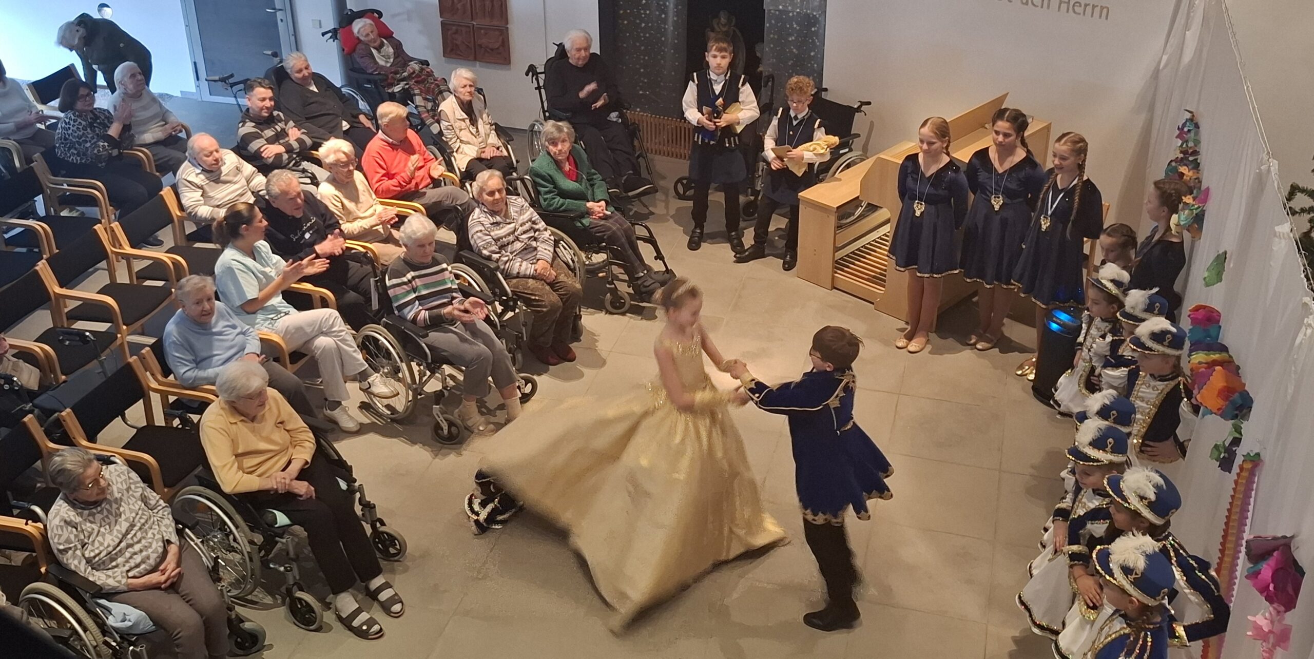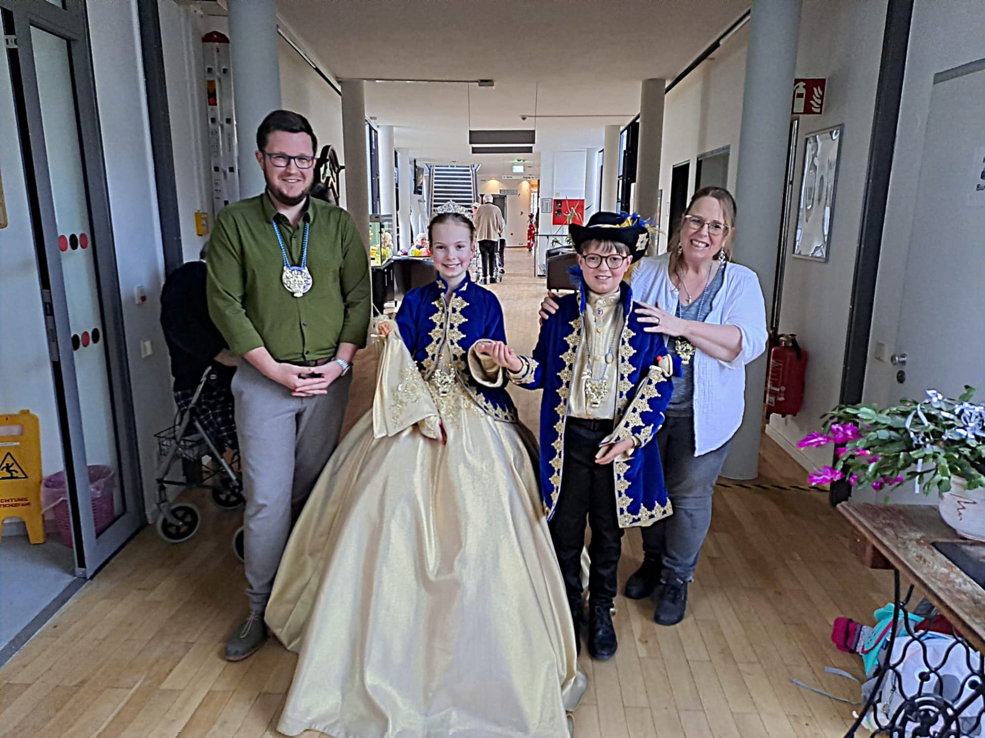 Faschingsstimmung im Kreis-Seniorenwohnheim Am Anger in Bad Wörishofen: Die Minigarde der Mindelonia zeigte ihren Garde- und ihren Showtanz. Auch das Prinzenpaar war zu Gast. Und es gab Faschingskrapfen. Einrichtungsleiter Rico Thumeyer (links) und Pflegedienstleitung Susanne Zodl (rechts) bedankten sich im Namen der Bewohnerinnen und Bewohner bei Prinzessin Anna I. und Prinz Linus I. (Bildmitte) für den Besuch.