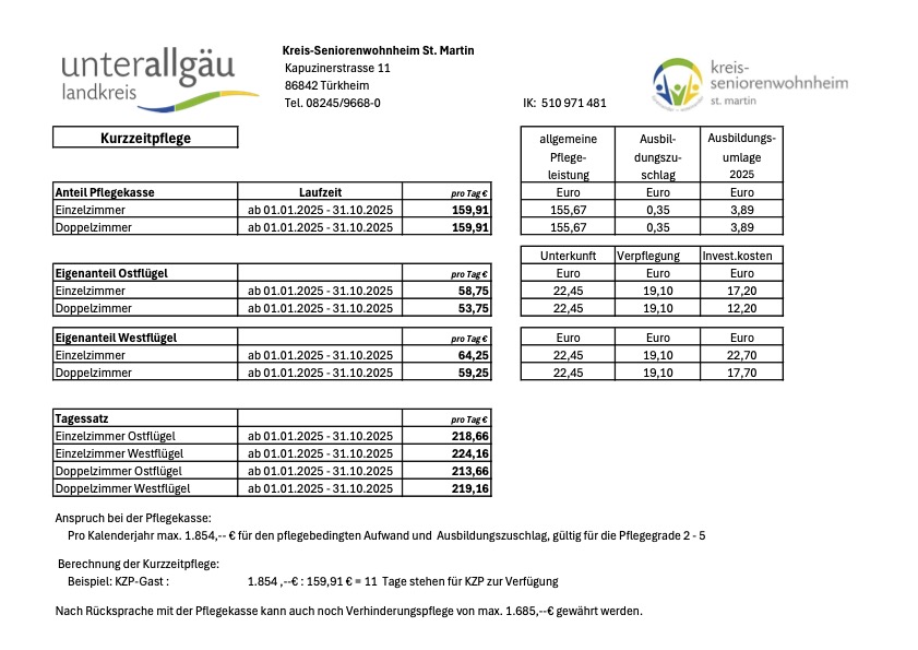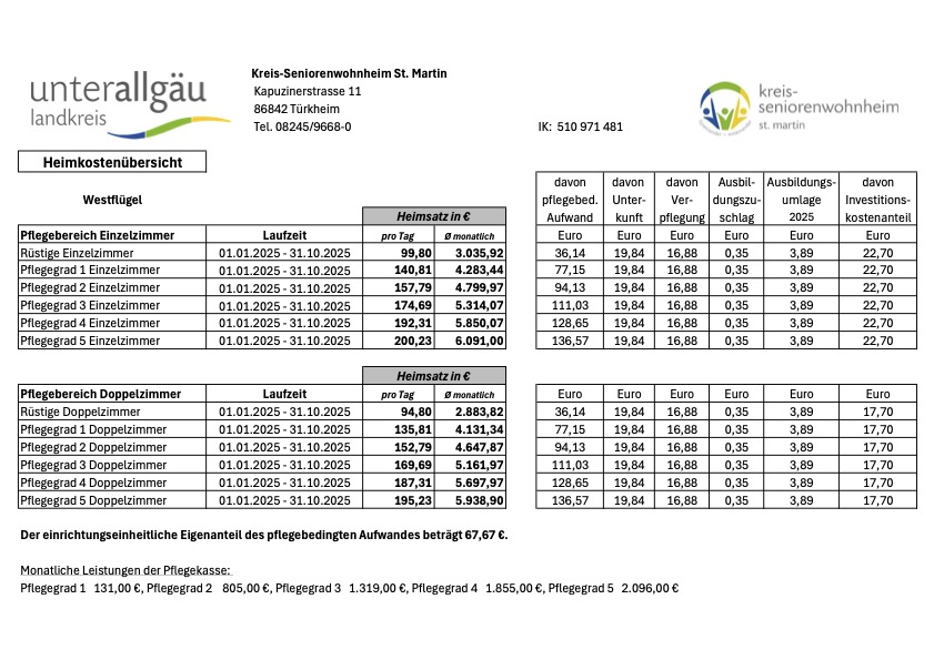 Seit dem 1. Januar 2017 wurde mit dem neuen Pflegestärkungsgesetz II die Berechnung verändert. Es gibt neue Pflegegrade für die Einstufung der Pflegebedürftigkeit. Gleichzeitig zahlt die Pflegekasse mit jedem höheren Grad einen höheren Anteil, so dass für die Pflegegrade 2 – 5 die Kosten für die Bewohner gleich bleiben (einrichtungseinheitlicher Eigenanteil).